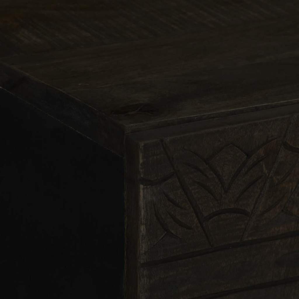- Material: Solid mango wood with light grey finish, engineered wood, glass