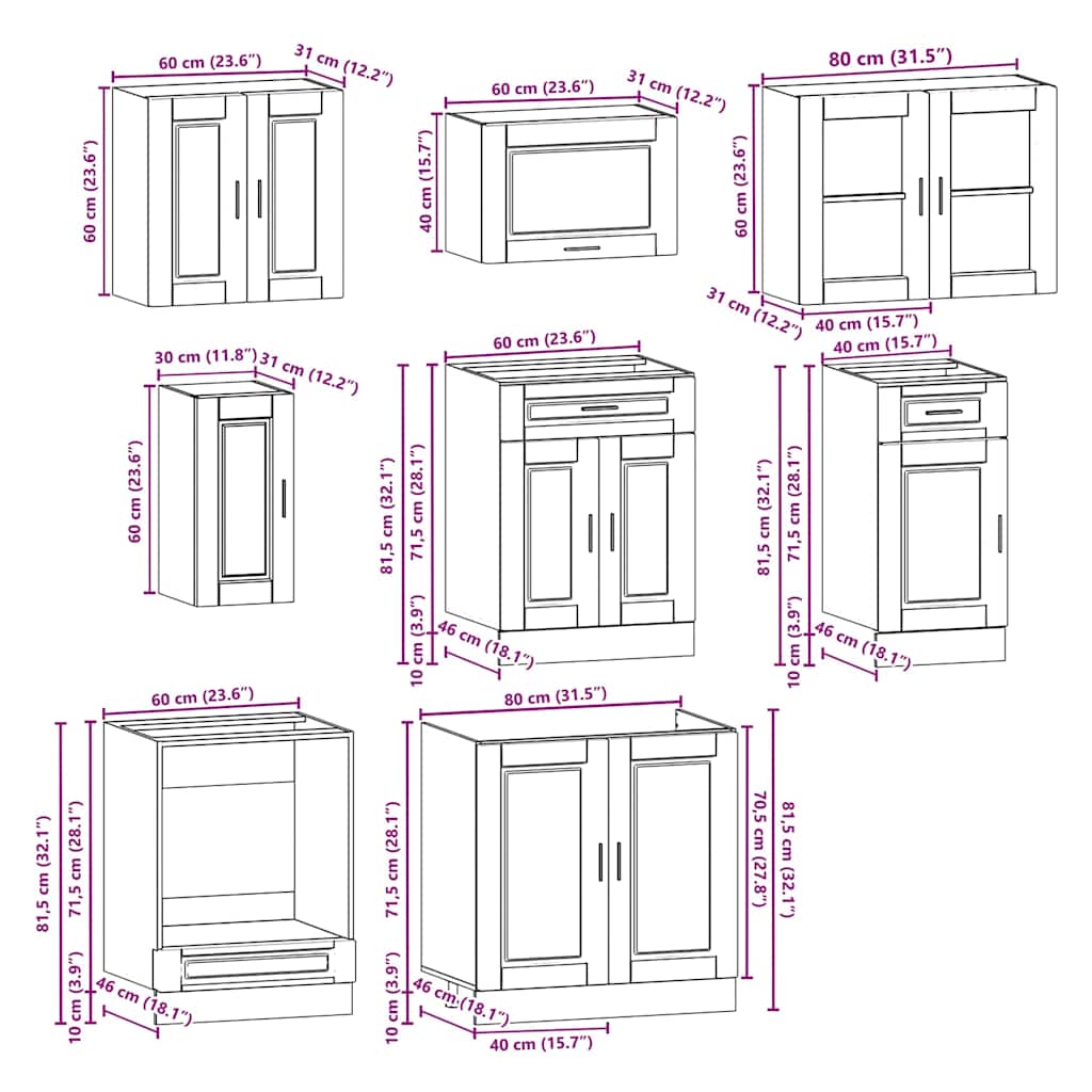 - 1 x Sink base cabinet: 80 x 46 x 81.5 cm (W x D x H)