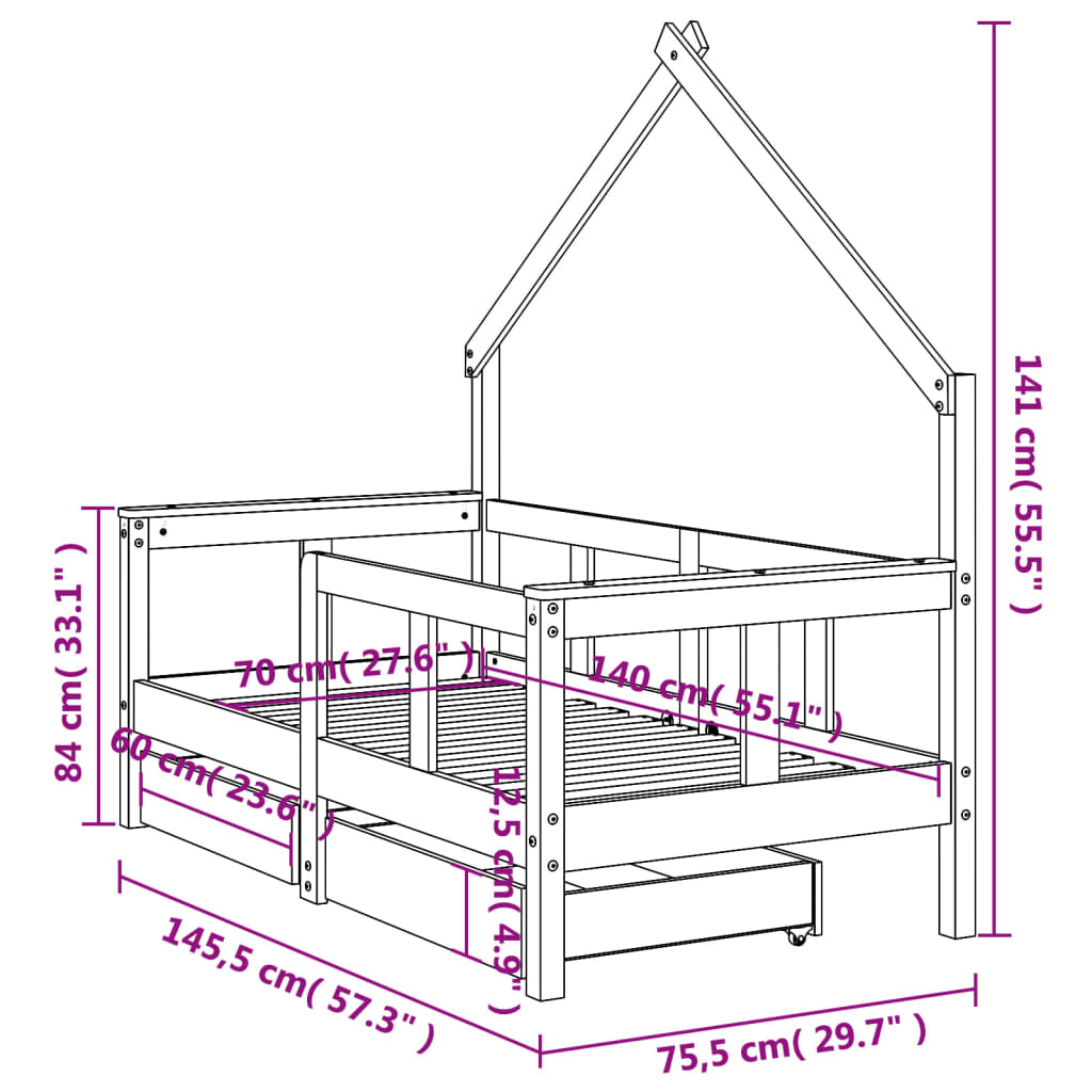 - Solid pine wood: The kids bed frame is made from solid pine wood. Solid pine wood is a beautiful natural material. Pine wood has a straight grain, and the knots give the material its signature, rustic look.